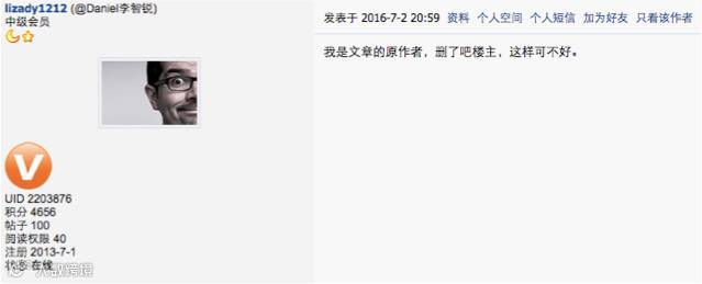 原作者在发现后,曾在帖中留言:“我是文章的原作者,删了吧楼主,这样不好。”[k]。