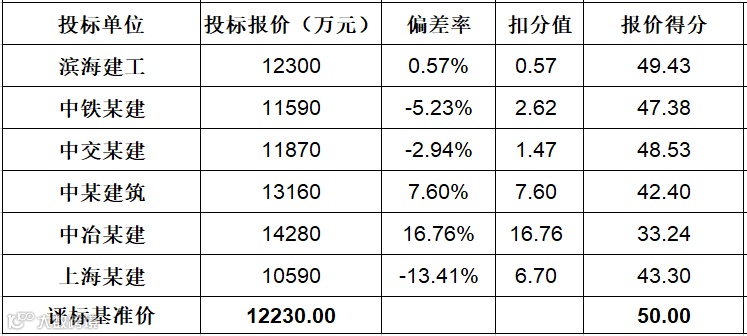 计算程序一般先对有效报价进行入围(去掉若干最高价和最低价),再用入围报价进行评标基准价的计算,然后按照基准价上下减分(加分)计算公式进行投标报价得分计算。