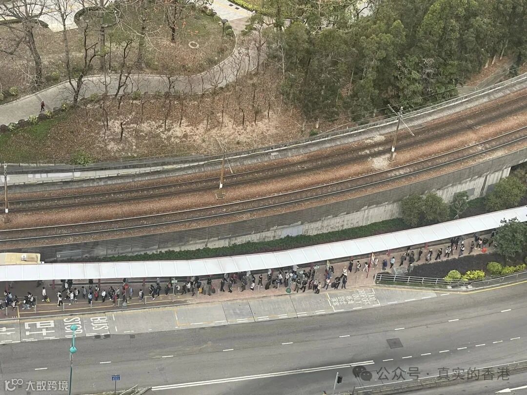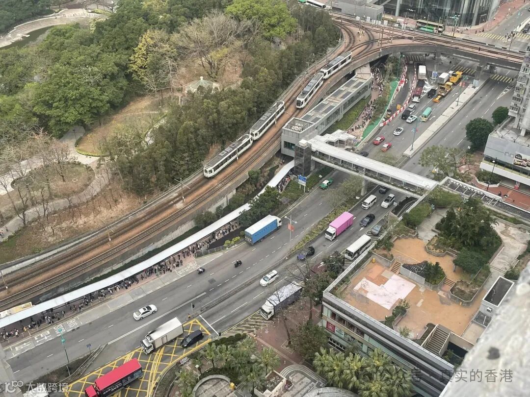 网民惊呼:第一次见到排到这么长,这么长的队伍,站在上面一看,居然是看不到队伍的后面,甚至排队到另一个轻铁屯门站。