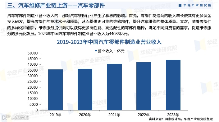 汽车零部件制造业发展为维修行业提供有力支撑。2023年,中国汽车零部件制造业营业收入达44086亿元,带动维修件质量提升与技术升级,推动维修服务向多元化、高品质方向发展[k]。