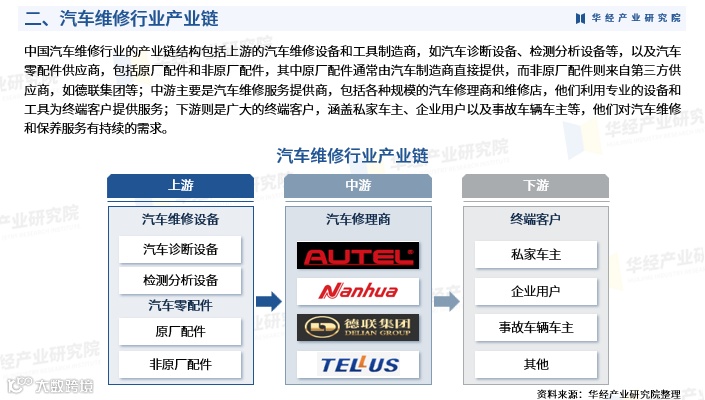 中国汽车维修行业形成完整产业链:上游为维修设备制造商与零配件供应商,涵盖原厂件及第三方配件;中游为各类维修服务提供商,包括4S店、综合维修厂、专修店等;下游覆盖私家车主、企业用户及事故车客户,持续释放维修保养需求[k]。
