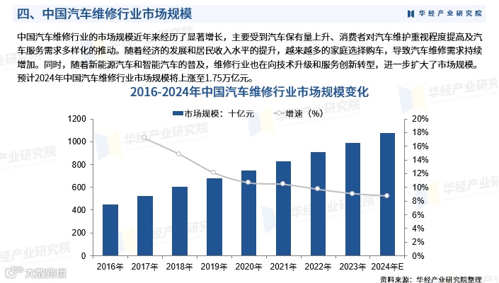 在汽车保有量上升、居民收入增长及消费理念转变推动下,中国汽车维修市场规模持续扩大。新能源与智能汽车普及加速行业技术革新与服务升级,预计2024年行业市场规模将达1.75万亿元[k]。