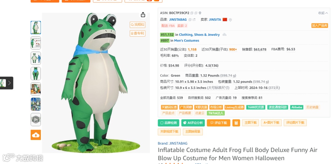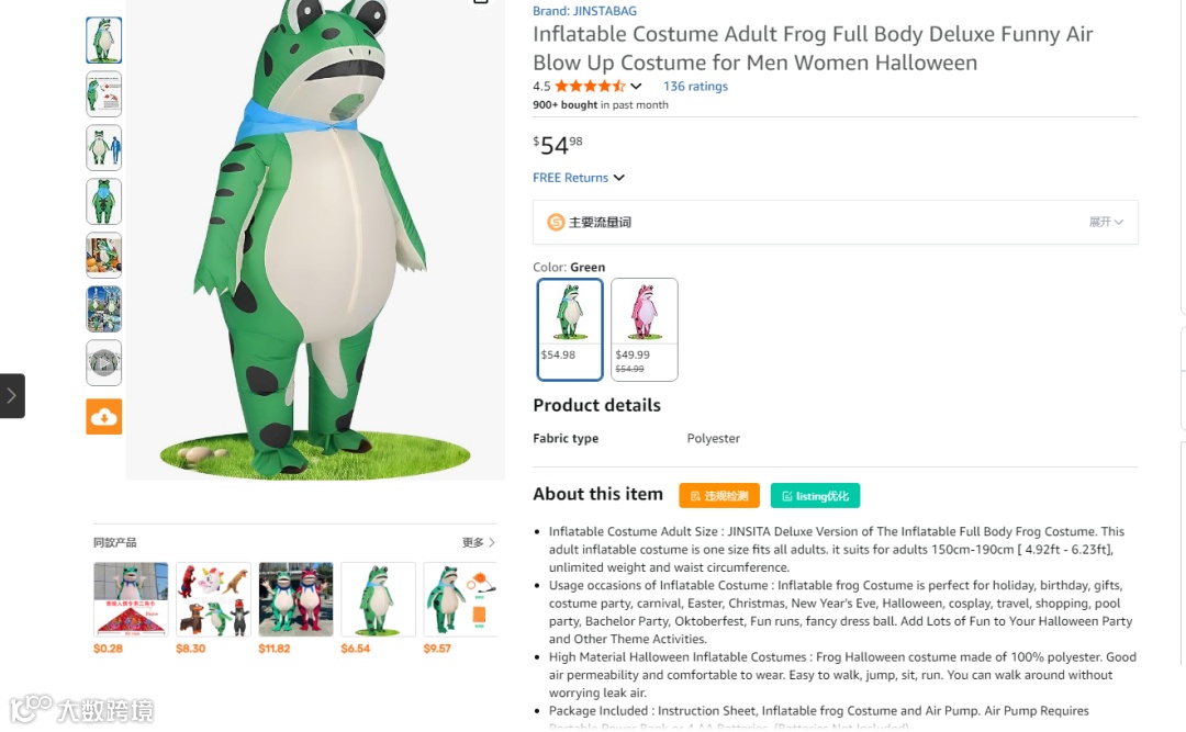 inflatable frog costume(流量占比20.36%,该关键词的CPC0.49美金)