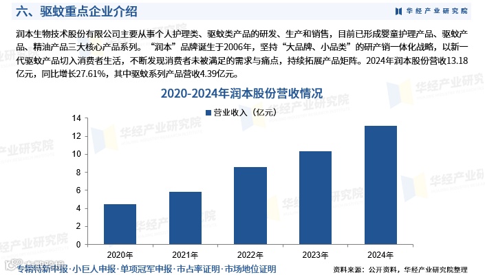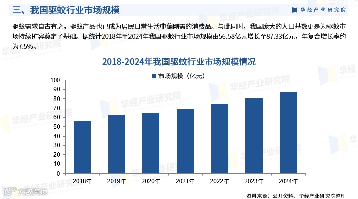 受益于居民日常刚需及庞大人口基数,中国驱蚊市场需求持续增长[k]。2018年至2024年,行业市场规模从56.58亿元增至87.33亿元,年均复合增长率约7.5%[k]。