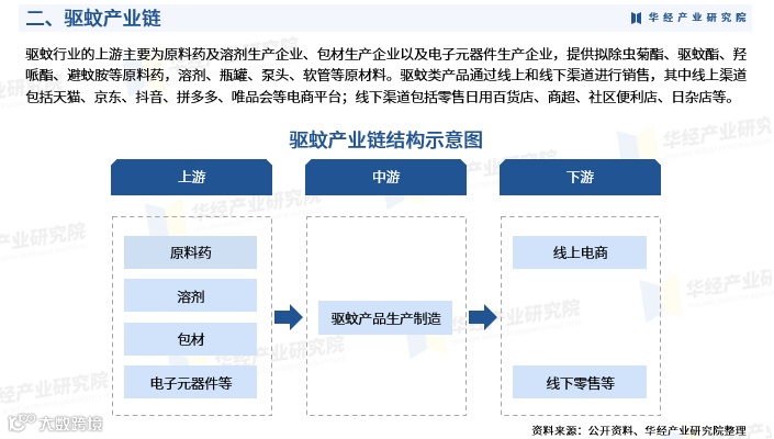 行业上游主要依赖拟除虫菊酯、驱蚊酯、避蚊胺等原料药及溶剂、包材、电子元器件的供应[k]。下游销售渠道覆盖线上与线下,线上包括天猫、京东、抖音、拼多多等主流电商平台,线下则以商超、便利店、日杂店为主[k]。