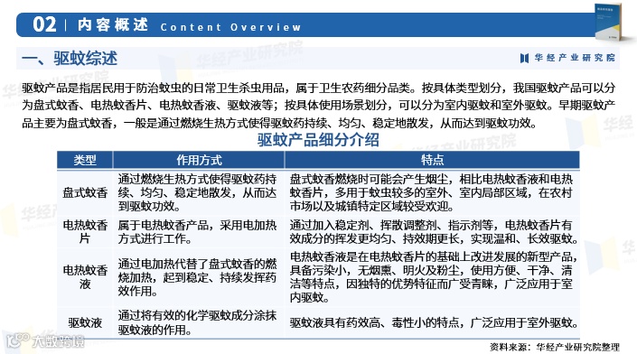 驱蚊产品属于卫生农药细分领域,主要用于防治蚊虫侵扰,涵盖盘式蚊香、电热蚊香片、电热蚊香液、驱蚊液等类型,适用场景分为室内与室外[k]。早期以燃烧型盘式蚊香为主,通过加热释放有效成分实现驱蚊效果[k]。