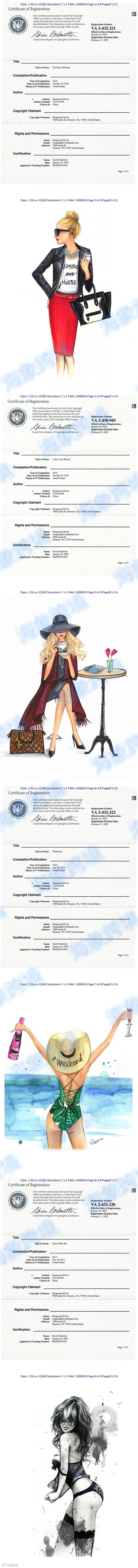 原告 Rongrong DeVoe 是一位时尚插画家,其大胆的插画作品以女性赋权、自爱和包容为主题。她为业余爱好和工艺品零售商销售的多种产品,包括日记本、计划本、邮票和其他配饰,在社交媒体上引起了巨大轰动,线上和线下销售一空,创造了数百万美元的销售额。 DeVoe 还授权将艺术作品用于服装、化妆品、日历、礼品、桌面装饰、家纺、墙面装饰、箱包等。