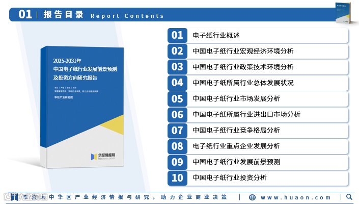 报告内容涵盖行业概况、宏观经济与政策技术环境、2020-2024年产业发展状况、市场运行分析、进出口格局、竞争结构及重点企业研究,包括江西兴泰科技、广州奥翼电子、苏州清越光电、浙江东方科脉、无锡威峰科技等代表性企业[k]。同时,报告对2025-2031年行业前景、技术方向与投资机会进行专业预判,是把握电子纸行业动态的重要参考工具[k]。