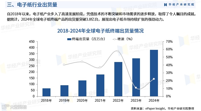 自2018年起,电子纸产业进入高速增长期。2024年,全球电子纸终端产品出货量突破3.8亿台,市场规模达52.3亿美元,较2018年的21亿美元实现显著增长,六年复合年增长率(CAGR)达16.43%[k]。随着彩色化与大尺寸技术的成熟,电子纸正加速拓展至智慧零售、商业显示、教育应用等领域,推动显示技术的绿色可持续发展[k]。