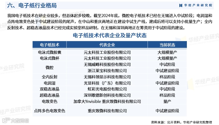 在中国,电子纸技术研发进程加快。截至2024年底,微腔电子纸已在无锡进入中试阶段;电润湿与点阵电致变色技术的中试线在中山和重庆接近建成,即将支持小批量生产;全内反射与超稳态液晶技术已完成实验室样品开发,正筹备中试建设资金,分别布局于无锡和深圳[k]。