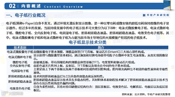 电子纸(Electronic Paper,简称e-Paper)是一种不发光、依赖环境光漫反射成像的电子显示技术,具备零功耗或微安级超低功耗维持图像的特性[k]。当前主流技术主要为电泳式微胶囊与微杯电子纸,已进入大规模量产阶段,占据市场主导地位;其余技术如微腔、电润湿、全内反射、胆甾相液晶及电致变色等也在持续发展中[k]。