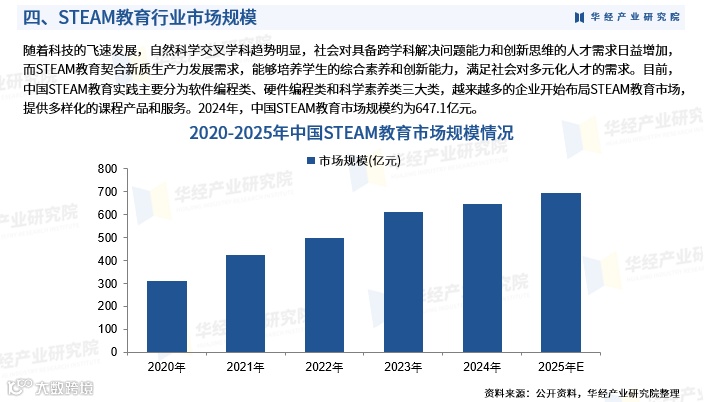 伴随科技发展与新质生产力对复合型人才的需求上升,STEAM教育契合社会对跨学科解决问题能力的迫切需求。当前中国STEAM教育主要涵盖软件编程、硬件编程与科学素养三大类别,市场参与企业持续增多,产品与服务日益丰富。2024年,中国STEAM教育市场规模达647.1亿元[k]。