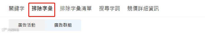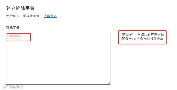 6.输入事先准备好的排除字汇,每行一个排除字汇,需注意匹配符号,”关键字”是片语比对排除字汇。[关键字]是完全比对排除字汇