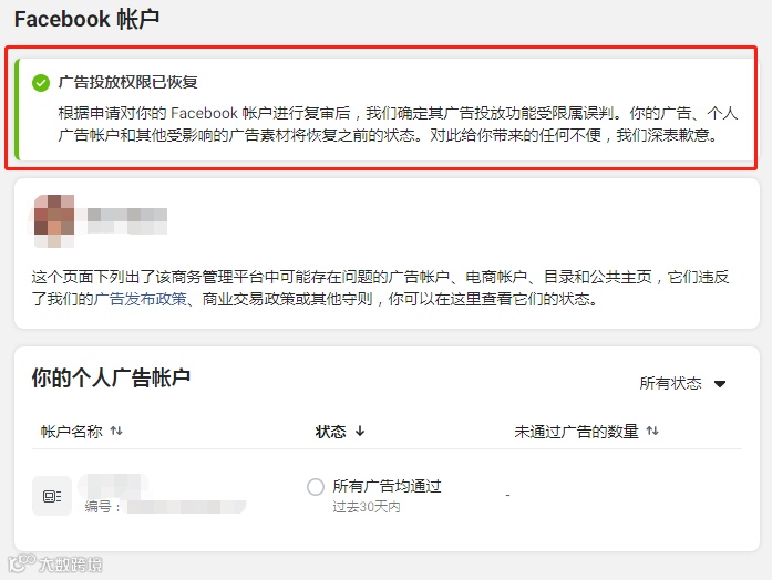 15.申请复审后,如果账户通过复审,解封通过会是下图,广告投放权限已恢复