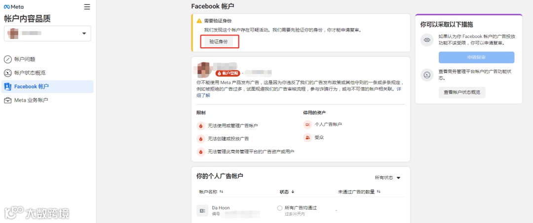 2.这里便是账户内容品质,在这里可以看到账户的状态,比如公共主页、个人账户等。现在可看到个人账户限制和停用的资产。在我们复审前,需要操作:删广告系列广告、删广告帖子。比如刚提交的广告,或者有可能违规嫌疑的广告。记得不光把广告系列删掉,还要删掉对应的广告帖子。删完之后,广告账户没有敏感的内容或广告,再进行复审操作。