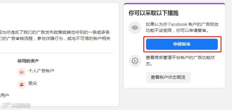 遇到个人号受限,首先解决办法就是复审,复审是有可能解限的,所以一定要去试一下。如果复审没通过,需要评估下受限影响再做应对操作,比如有没有其他个人号可供操作,要不要再重新创建商务管理平台(BM)等等。