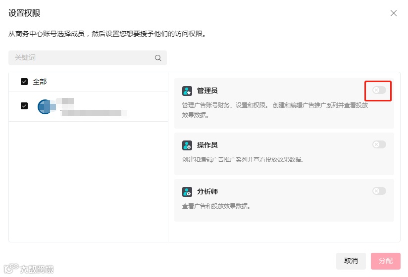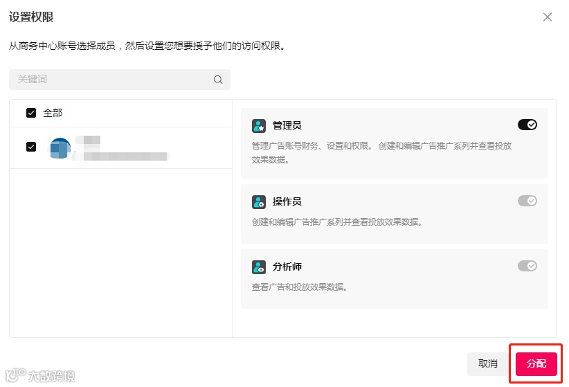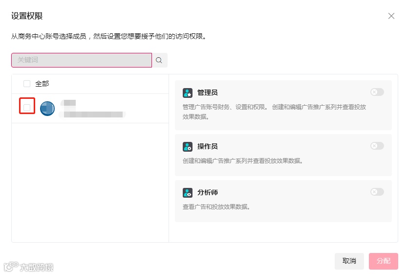7.选择要分配的成员。因为新TikTok广告账户,这里是没有任何一位成员的,所以即使是您自己,也要分配下。如果是别的成员,可以先在用户成员里邀请对方进入BC。