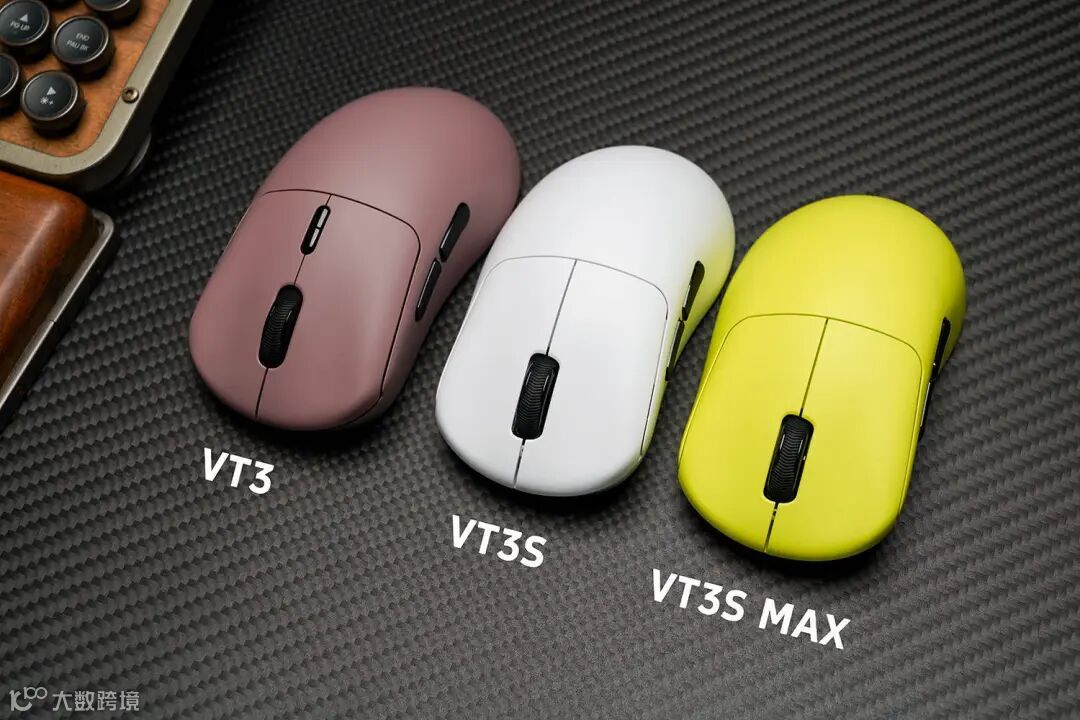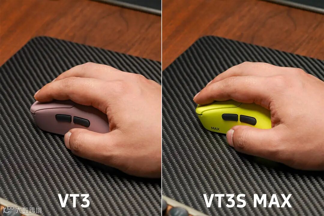 VT3和VT3s、VT3s MAX的区别是尺寸大小,VT3的三维是126.2*68.2*42.4 mm,适合大手用户,VT3s和VT3s MAX的三维是121*66*42 mm,适合中小手用户,并且VT3s和VT3s MAX取消了顶部的DPI按键,零冗余设计,简洁清爽,更加电竞化。