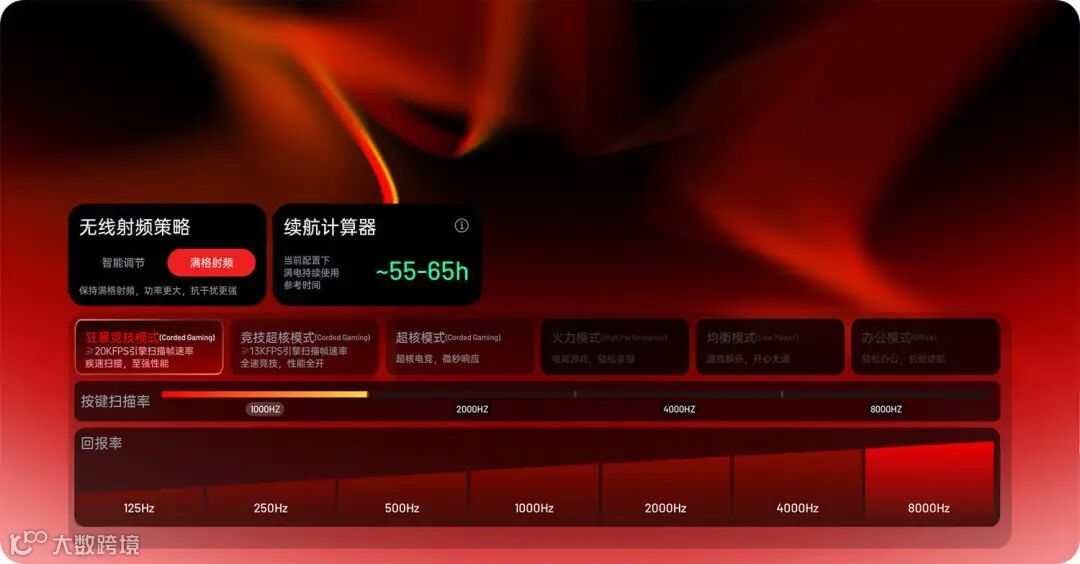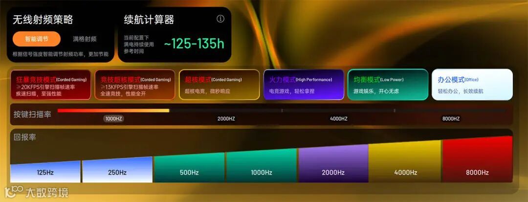针对不同的使用场景,VT二代技术平台给出了7档不同回报率和无线射频功率搭配的组合式方案,并且计算了续航时间,比如办公模式下,智能调节射频功率+125Hz回报率就能够满足,此时可以获得最大的续航效果,大概在980-1000小时之间,按每天8小时用量计算,差不多可以用4个月左右,这个续航能力是相当恐怖。最高性能,也就是无线射频全功率满格输出,回报率为8000Hz,开启狂暴竞技模式,使用时间也能达到70-80个小时,差不多8天左右。
