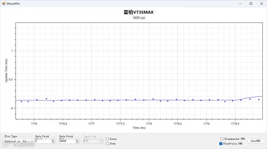 在MouseTester的Interval vs. Time中查看VT3s MAX的延迟情况,可以看到测试结果基本平衡地压在0ms这条直线上,几乎没有波动。