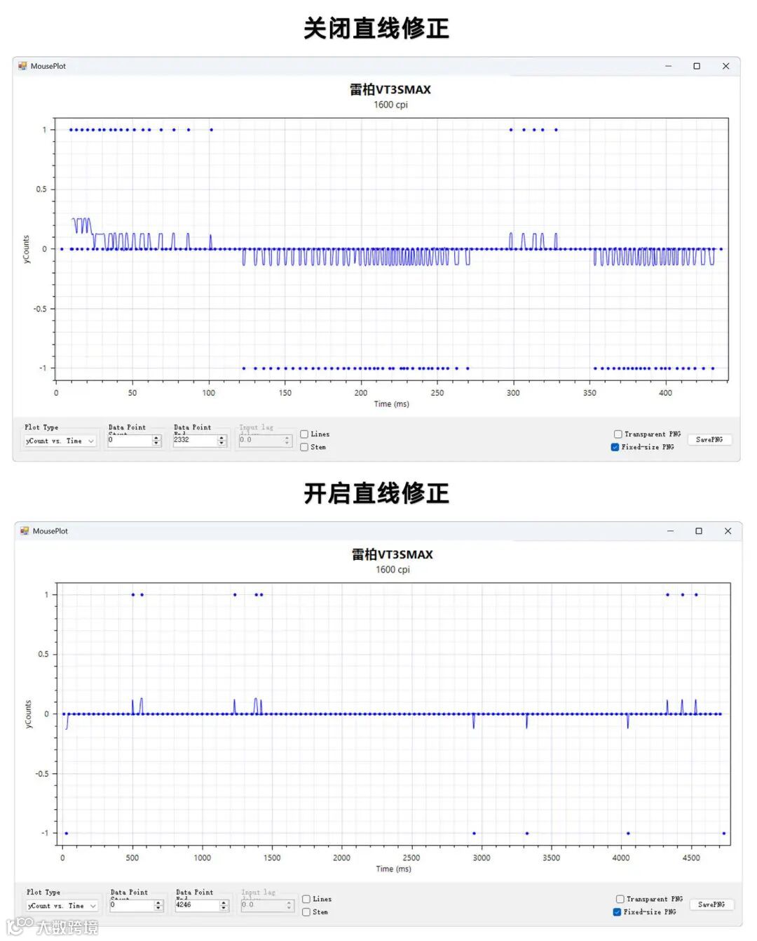 FPS类游戏可以开启直线修正来锁定爆头线,如果是RTS或者MOBA这类需要精准点选的游戏,最好还是关闭。MouseTester的yCount vs. Time可以用来测试直线修正的功能,从结果来看,结果还是相当不错的。