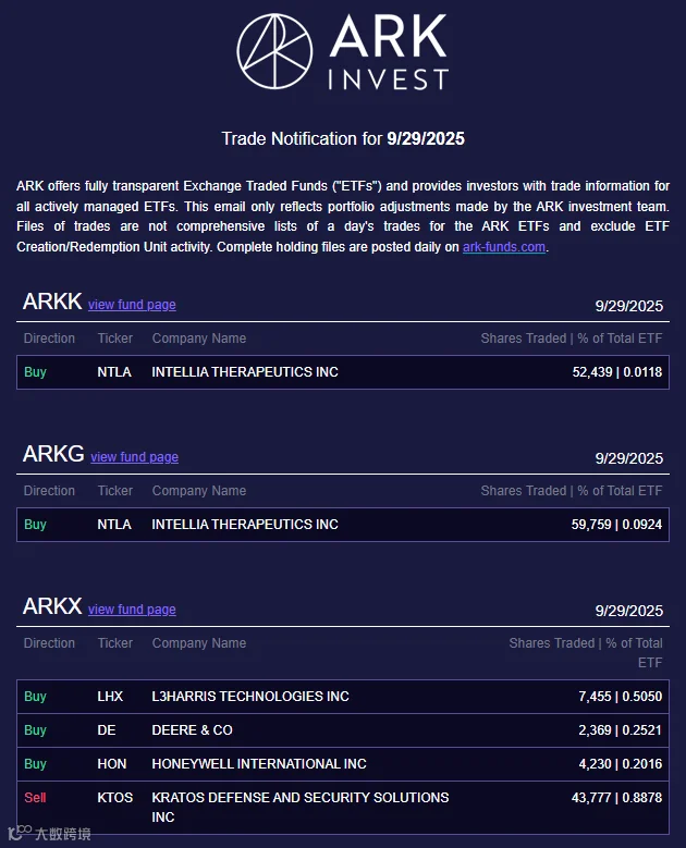 9月29日,木头姐旗下多只基金延续“基因编辑赛道加力 + 工业科技标的布局”的节奏,核心操作如下: