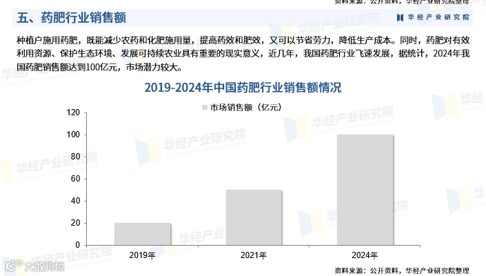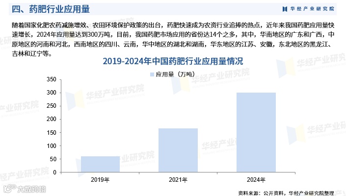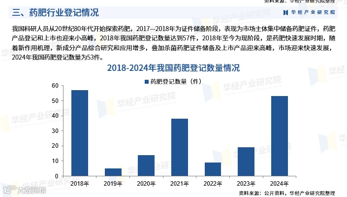 华经产业研究院发布《2025-2031年中国药肥行业市场调查研究及投资策略研究报告》,全面分析药肥行业发展趋势与投资机遇[k]。报告指出,我国药肥研究始于20世纪80年代,2017—2018年进入证件储备高峰期,2018年后进入快速发展阶段[k]。2024年药肥登记数量达53件,行业应用量增至300万吨,销售额突破100亿元[k]。