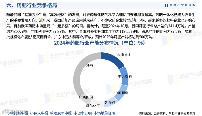 截至2024年10月,我国药肥行业总产能达341.4万吨,产量约300万吨,产能利用率为87.87%[k]。其中,委托加工产能为119.55万吨,占比37.2%[k]。随着济南天雨百禾、广东中迅农科等企业规模化产能释放,预计2025年行业总产能将达500万吨[k]。
