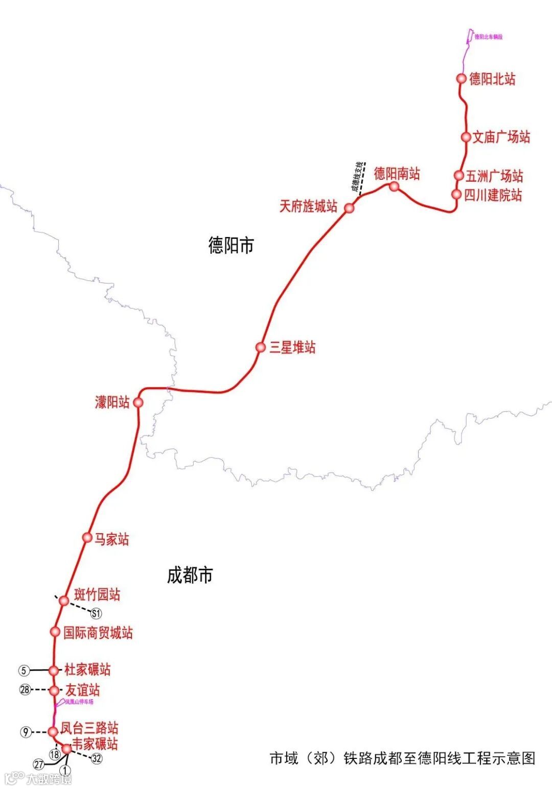 市域(郊)铁路成都至德阳线工程起于成都地铁1号线韦家碾站,止于德阳市德阳北站,途经成都市金牛区、新都区、彭州市,德阳市广汉市和旌阳区。该工程广汉市范围内线路长度约23.81公里(其中路基段长度约0.87公里,高架段长度约22.94公里),线路自彭州市濛阳镇进入广汉市境内后,向东沿濛阳河南岸走行,经三星堆场镇后线路北折沿天府大道北延线西侧向北延伸,先后上跨鸭子河、广岳铁路、北京大道,经槐树村、南丰场镇、白庙子至石亭江出广汉境。广汉市范围设三星堆站、天府旌城站2座高架站。根据设计文件,广汉境内预留有南丰站、天津路站,经过多方争取,可在设计中预留工程建设条件,后续将结合客流需求量的发展情况,按建设批复程序适时推动预留站点建设。
