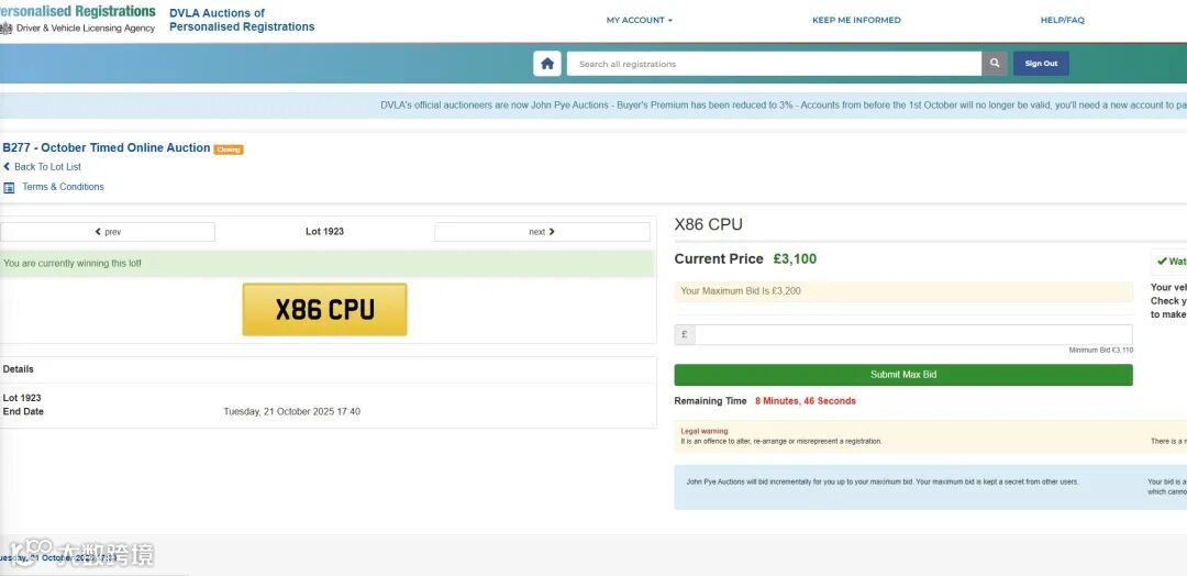 算上 20% VAT、3% buyer’s premium(加上VAT)、再加上 DVLA 的 £80 手续费,这块车牌的总成本已经超过 £6000。只能说:太贵了。