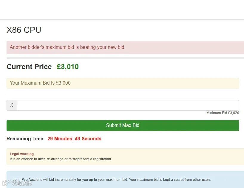我最后出到 £3620,心想也差不多了,再加已经超出心理价。(原本我以为最多1000英镑就能拿下的。)