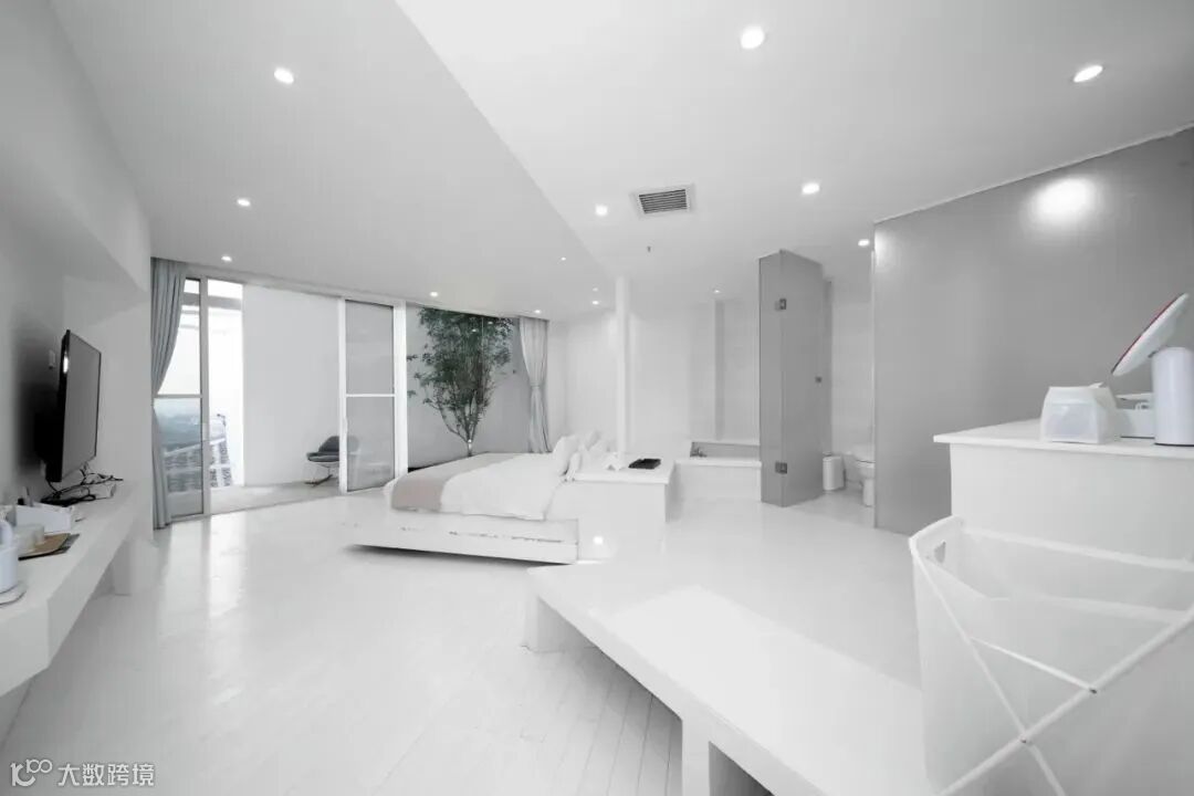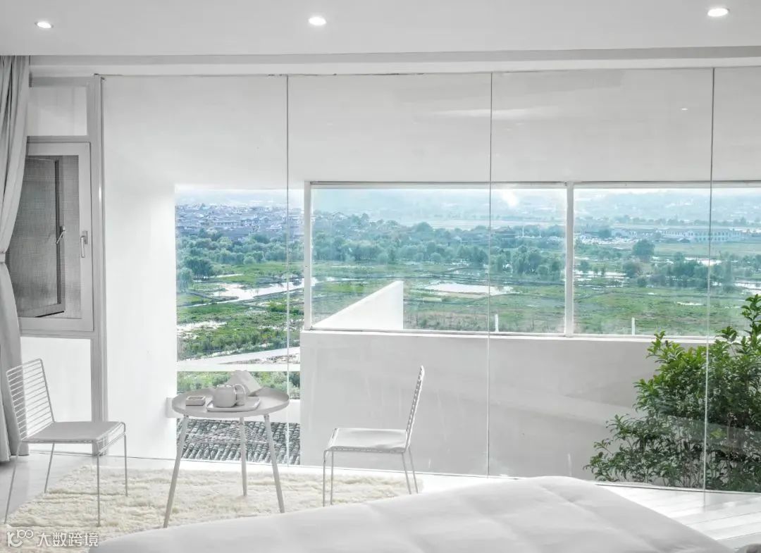 客房也延续了纯白空间,立体设计,房间内没有多余的颜色,只有无尽的白和远处自然的自然美景,彷佛身处云端,遥望腾冲美景。