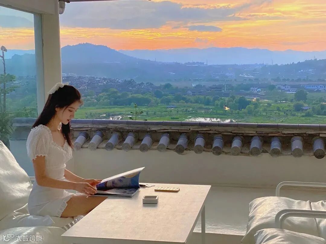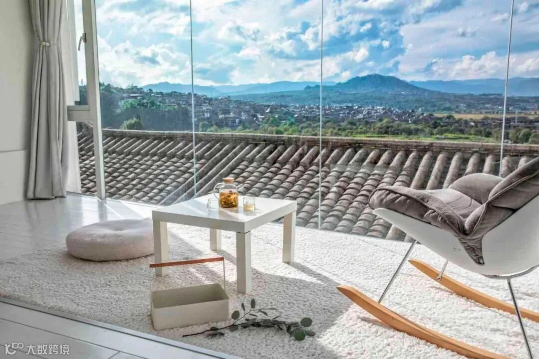 白色的房子和周围的白族民居融为一体,走进院子,开阔的空间、草坪、泳池映入眼帘,坐在庭院的沙发上,看着天空、远处的洱海、近处的三座塔还有对面的山,都是一种极致的享受。