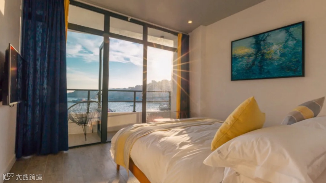 梵屿每间客房都有不同的设计风格,10间客房全部面向大海,高大的落地窗框进180度以上的无敌海景风光,本次套餐房型包括悠享海景大床房和精选海景大床房。