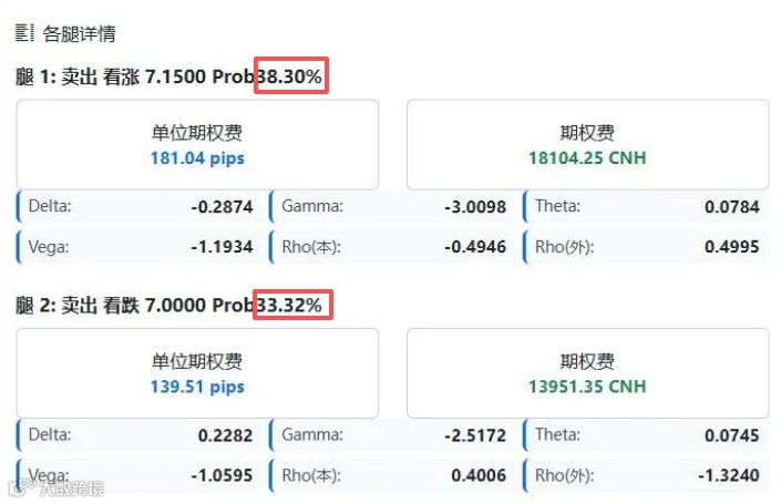我们以当下节点的USDCNH三个月的期权为例,目前USDCNH的实时即期汇率为7.1282,三个月远期汇率为7.0885。