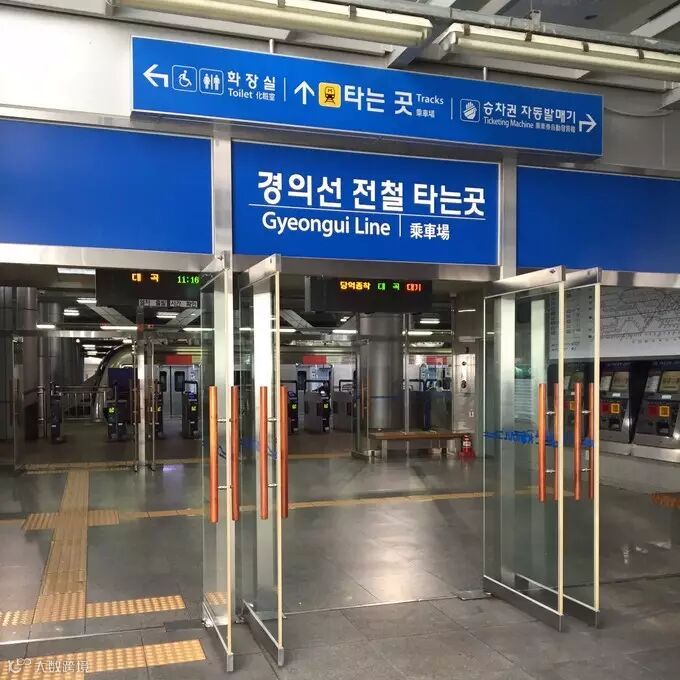 其实不然,去梨大需要在首尔站转中央京义线,这条线应该不算是一个地铁线路,而是类似机场铁路那种。一定要记住它叫Gyeongui Line!因为之前不知道这么难找,而且地图上只给了中文和韩文翻译,我们不能完全确定GL就是中央京义,地铁站对这条线的方向指示不是特别清楚,再加上从首尔站去这条线要绕挺远,真的找的挺费劲。最后看到下面这扇门的时候,真是解脱了。