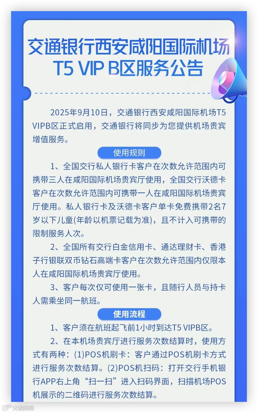 今日,交行陕西分行发布公告,2025年9月10日,交通银行西安咸阳国际机场T5VIPB区正式启用,交通银行将同步为客户机场贵宾增值服务。