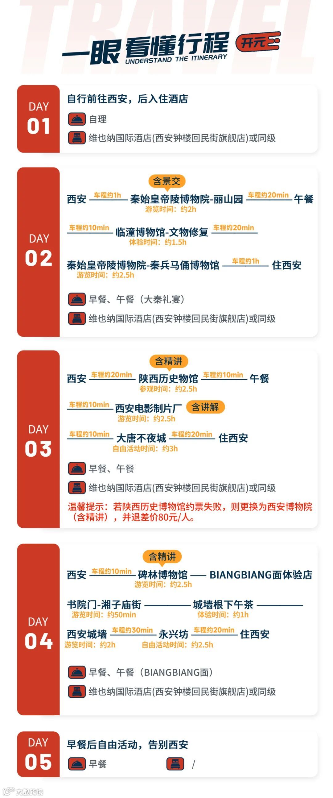 5.用餐:全程含4早餐3正餐,餐标60元/人+大秦礼宴餐标100元/人(第二天午餐)+biangbiang面制作及用餐69元/人(第四天午餐)。