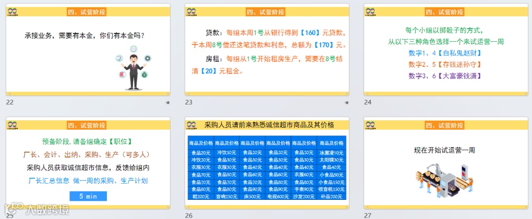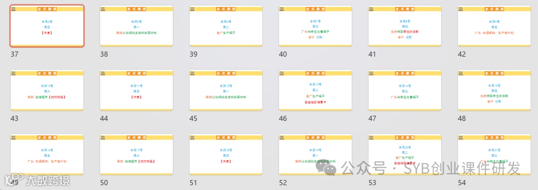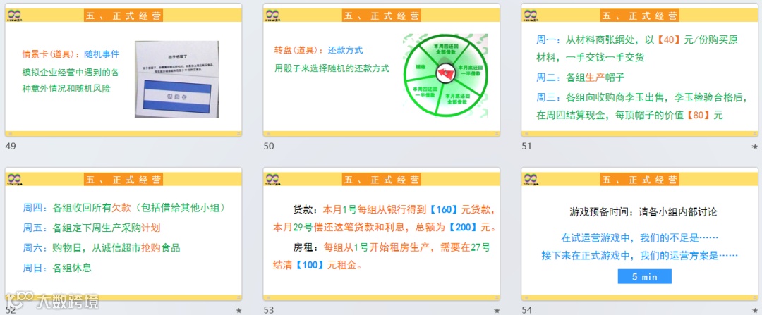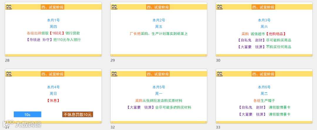 接着,需要重新回顾游戏基本周期规则,让学员加深记忆,再讲解贷款与房租的规则变化、让学员内部讨论改进的经营流程后,就可以开始正式的30天游戏了。