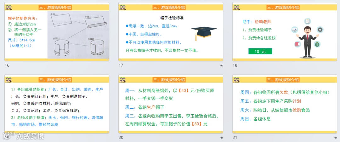 在以往的授课经历中,老师需要一边控制进度,一边检验帽子,一边收取和发放钱币,不免会手忙脚乱,所以这次新版本的课件增加了招募助手环节,把教学任务分出来一部分,这样老师负责最主要的控制进度环节即可。