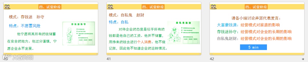 接着让各组扮演自私鬼赵财、存钱迷孙守和大富翁钱潇,这里只是让学员抽取扮演角色,而不进行角色讲解,并且还安排了对应角色的情景卡。