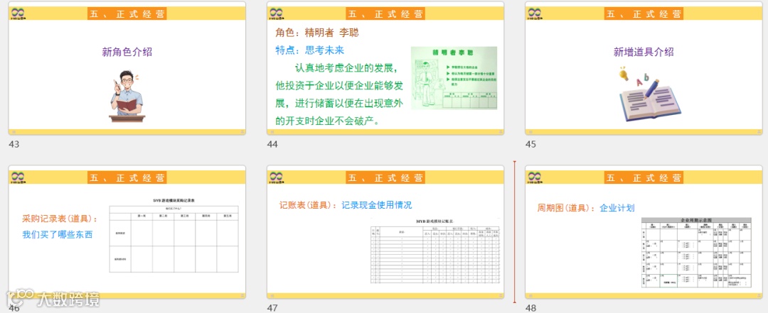 先介绍新角色精明者李聪的特点,然后介绍新增加的道具,包括采购记录表、记账表、周期图等。
