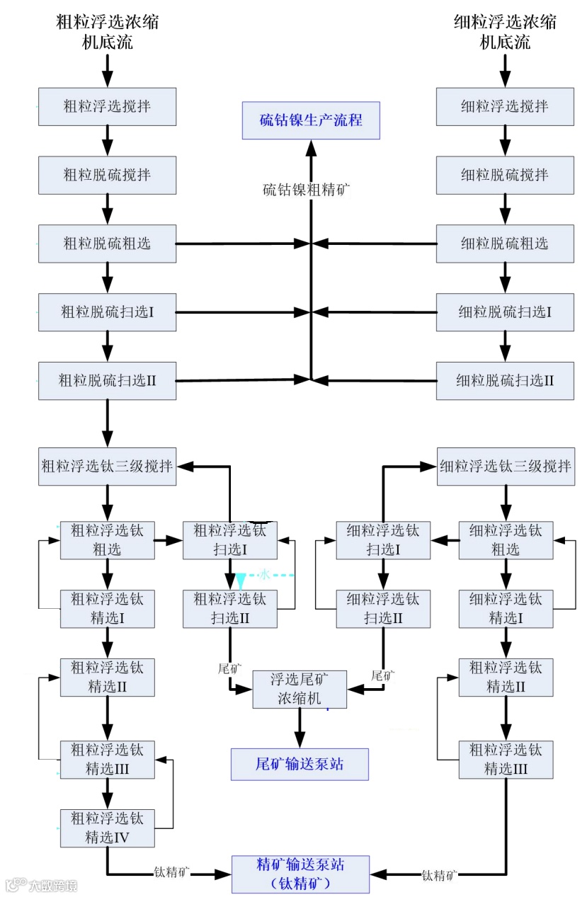 ◦ 粗粒选钛(处理一段选铁尾矿):一段选铁尾矿→脱铁→隔粗→一段粗粒尾矿球磨→强磁选→重选→强磁及重选精矿隔粗再磨→二段脱铁→浓缩→脱硫浮选(一粗两扫四精)