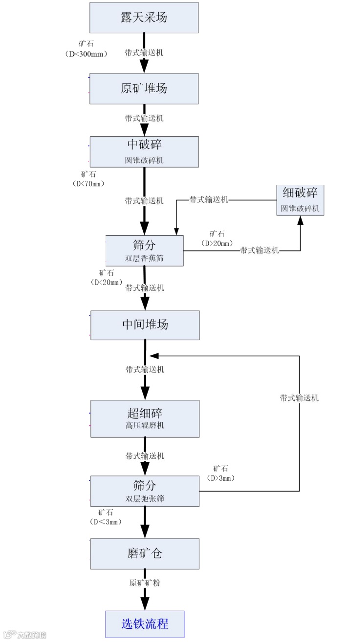 • 流程顺序:中碎→细碎→高压辊磨→3mm闭路湿筛→1mm筛分→一段球磨