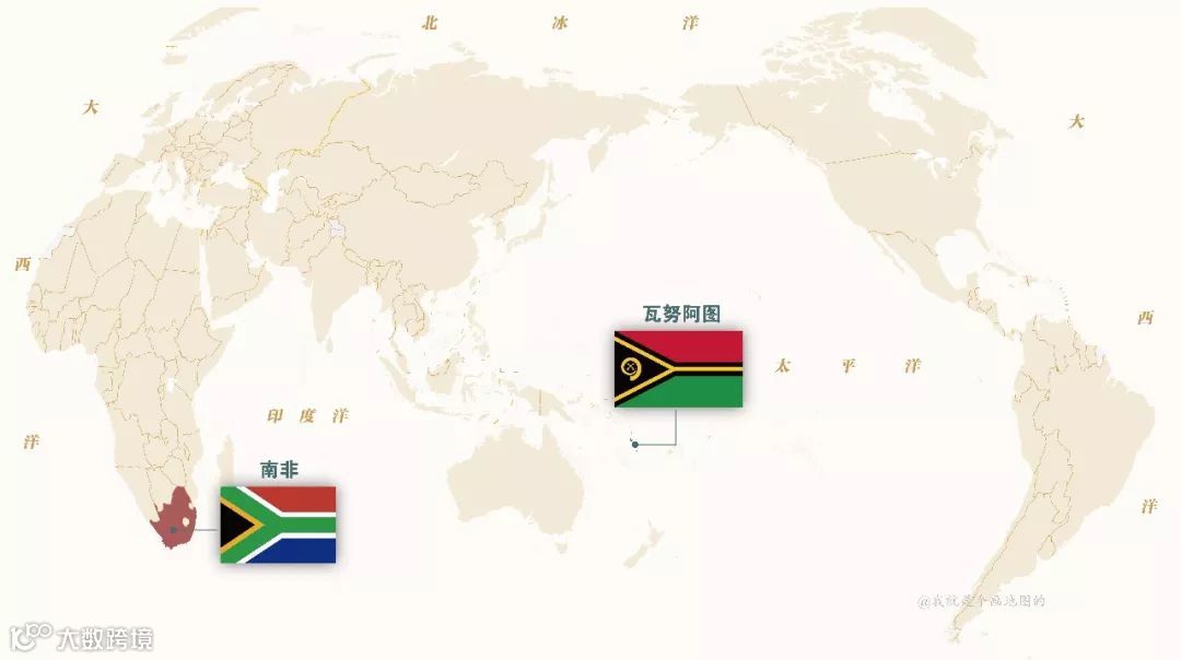 南非位于非洲南部,横Y形象征民族和解、民族团结。瓦努阿图是位于大洋洲的岛国,横Y形则表示的是该国岛屿的分布形状。