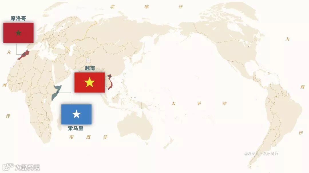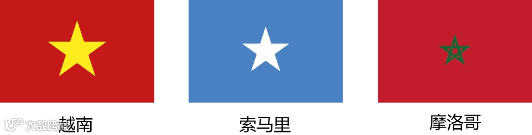 这三面国旗中越南有比较标准的共产主义配色;摩洛哥地处北非,绿色的星星带有伊斯兰教的含义。索马里国旗上的蓝色是为纪念联合国协助索马里从意大利独立,选择了和联合国旗帜一样的颜色,白色五角星分别代表原索马里的五个地区。