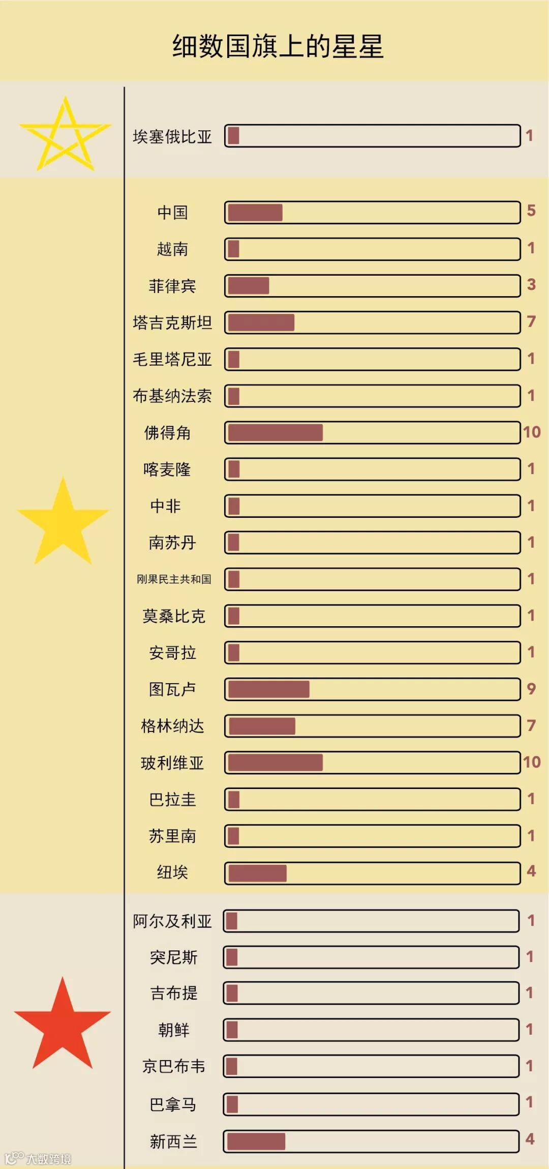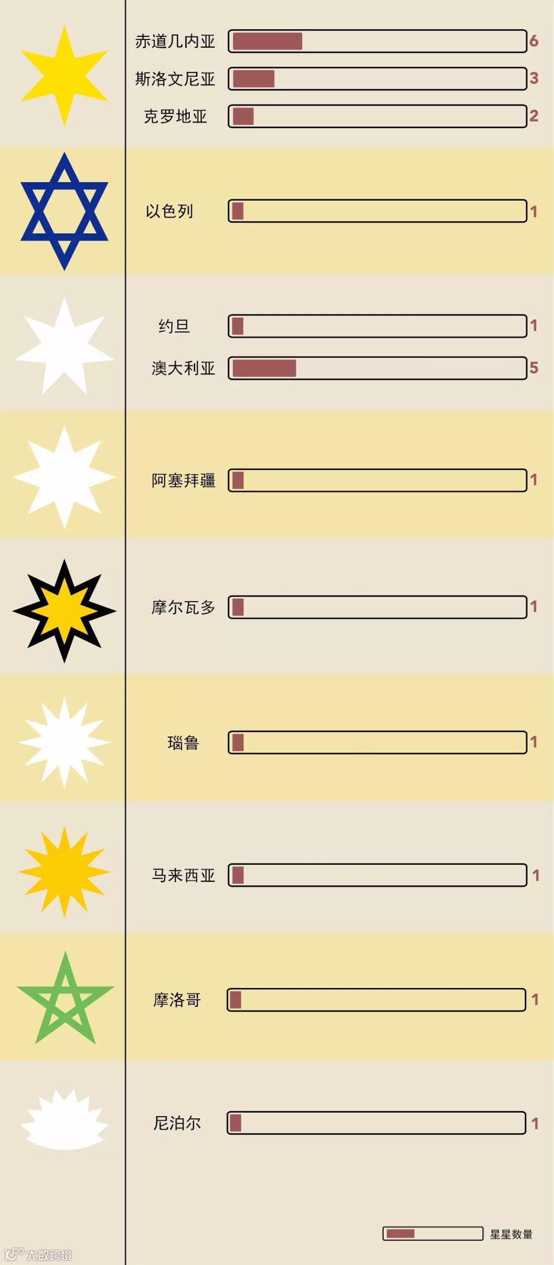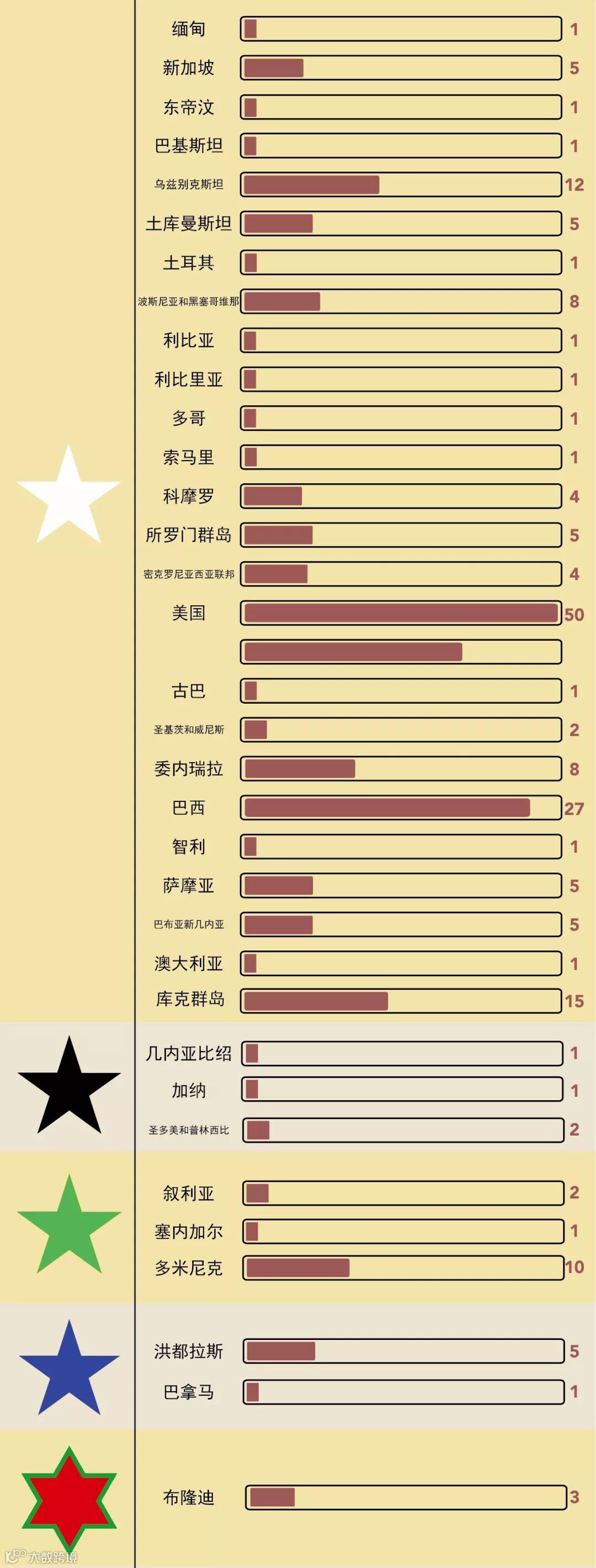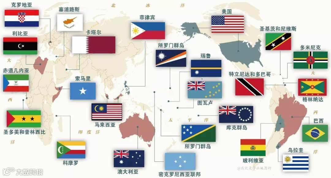 刚才说到了巴西国旗上的星星数目对应着国家的行政区,另一个被人熟知的案例应该是美国的星条旗上的50颗星星,那么,还有没有其他国旗上也有类似这种设计呢?