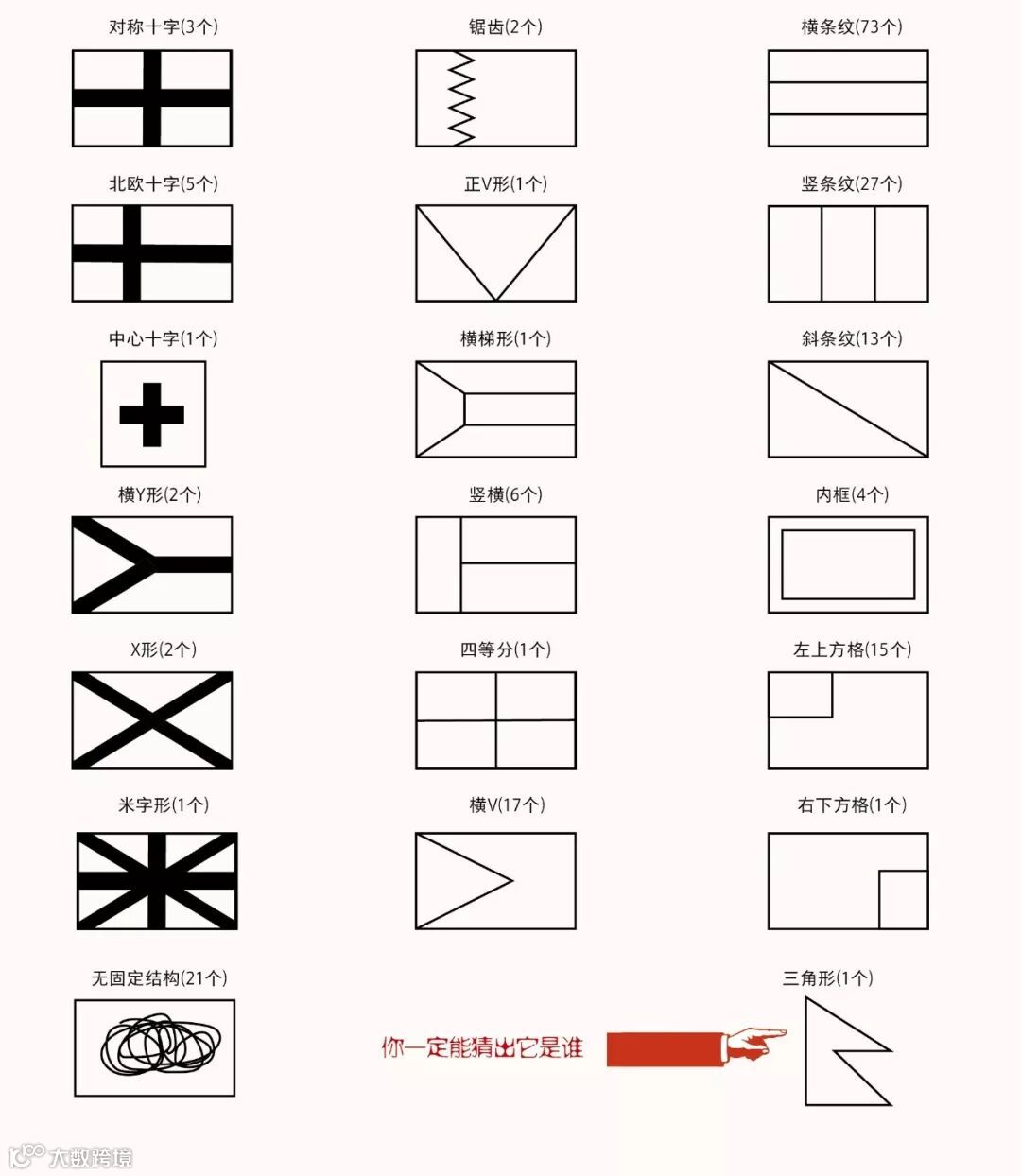 世界上国旗的样式看似五花八门,不过如果按照结构来区分,我们可以把他们分成二十种样式。