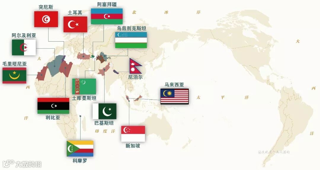 而其中除了新加坡和尼泊尔外,所有的星月组合都有象征伊斯兰教的含义。