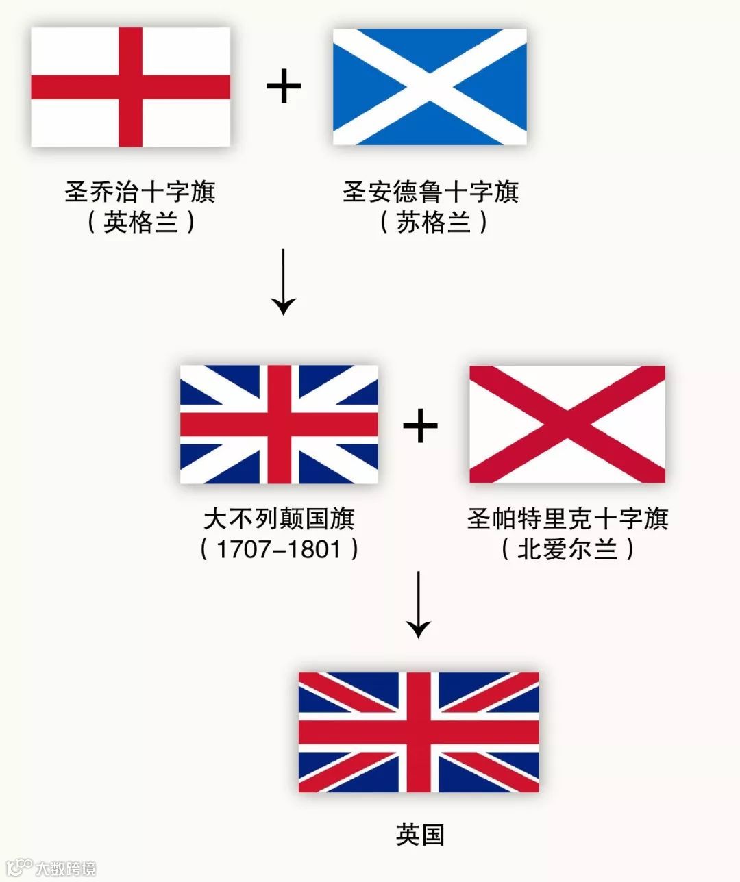 英国作为一个联合王国,是由英格兰、威尔士、苏格兰、北爱尔兰以及一系列附属岛屿共同组成,国旗上的米字就是由其中的英格兰、苏格兰和北爱尔兰的旗帜叠加而成的。